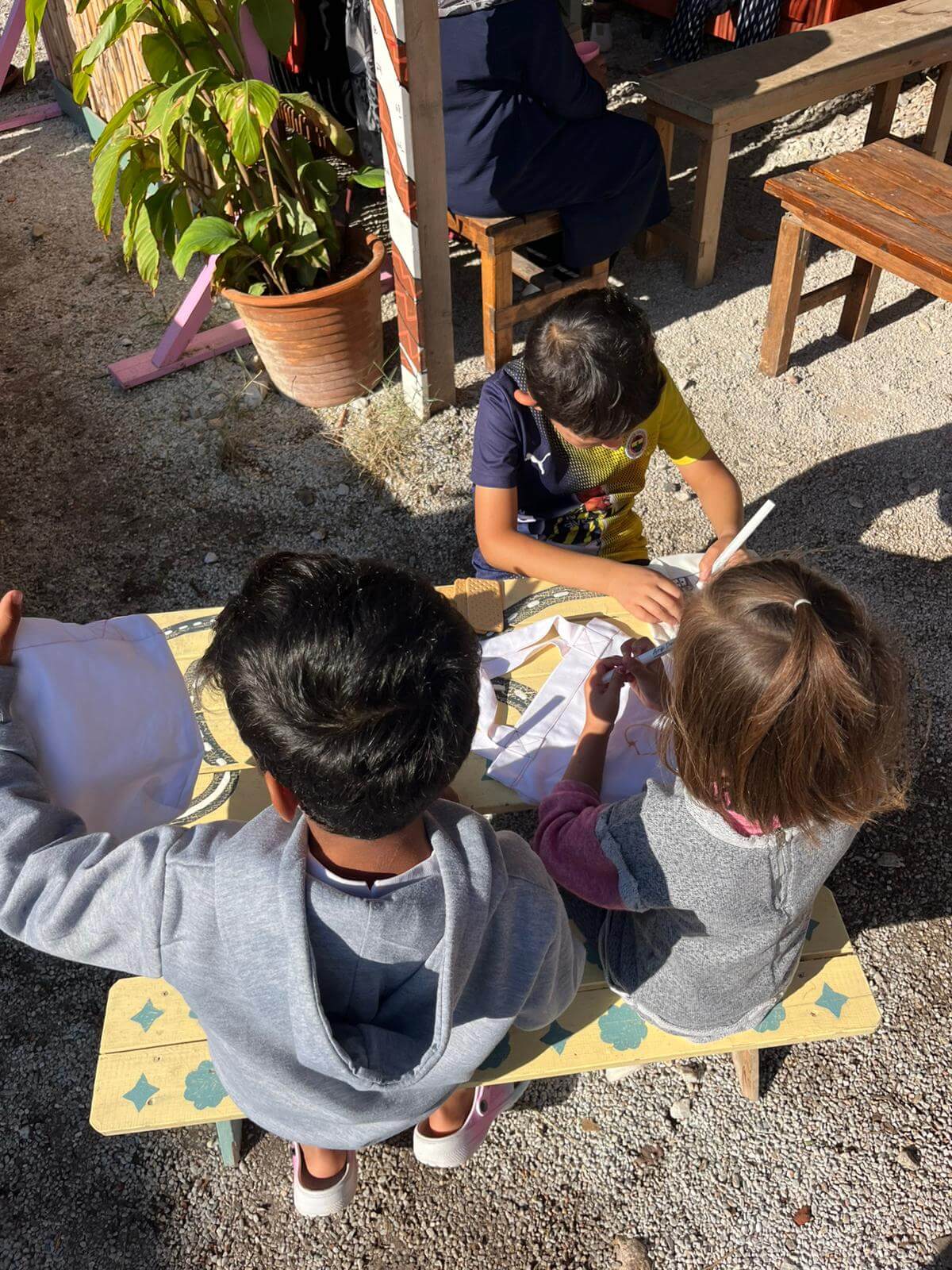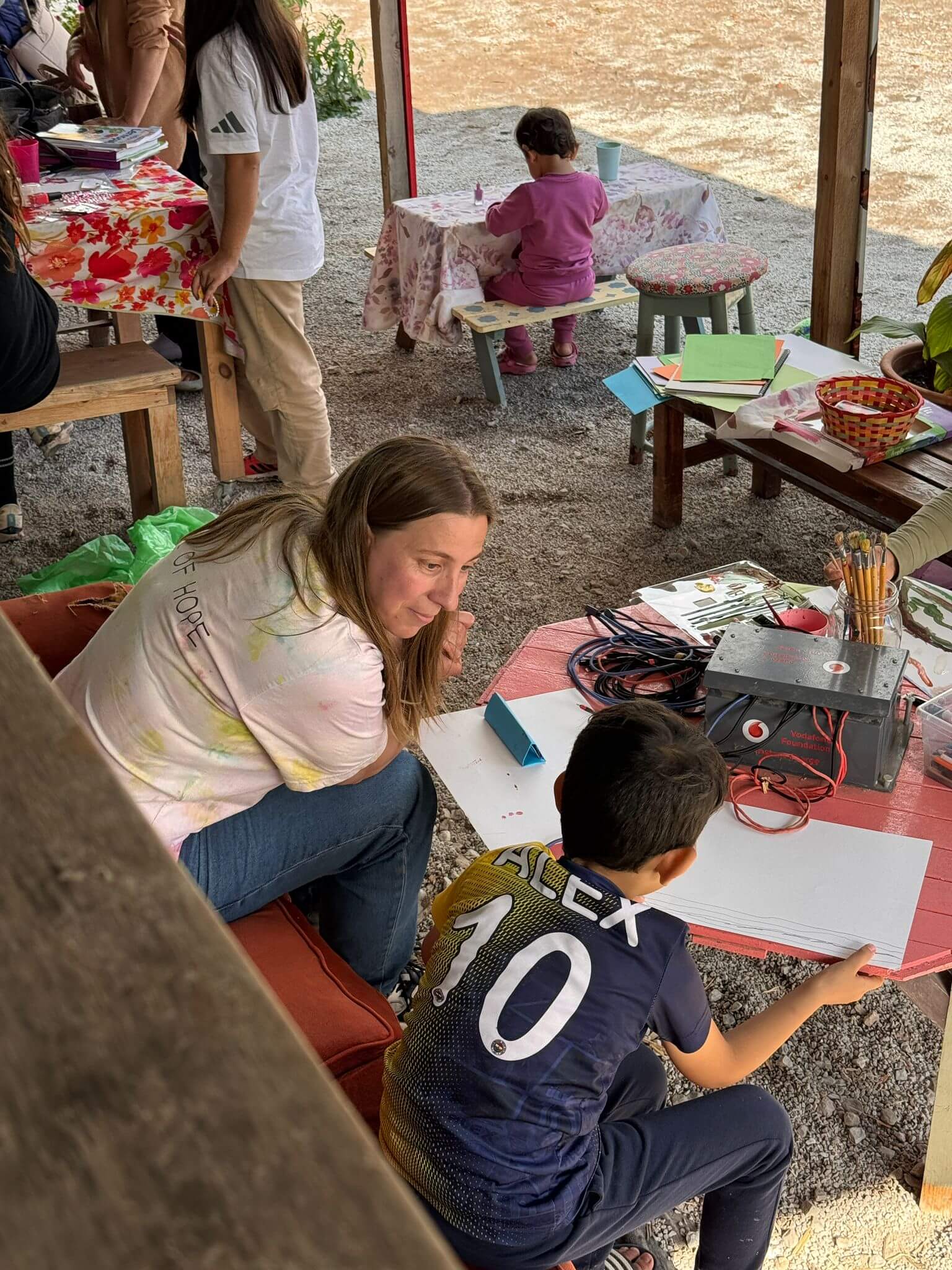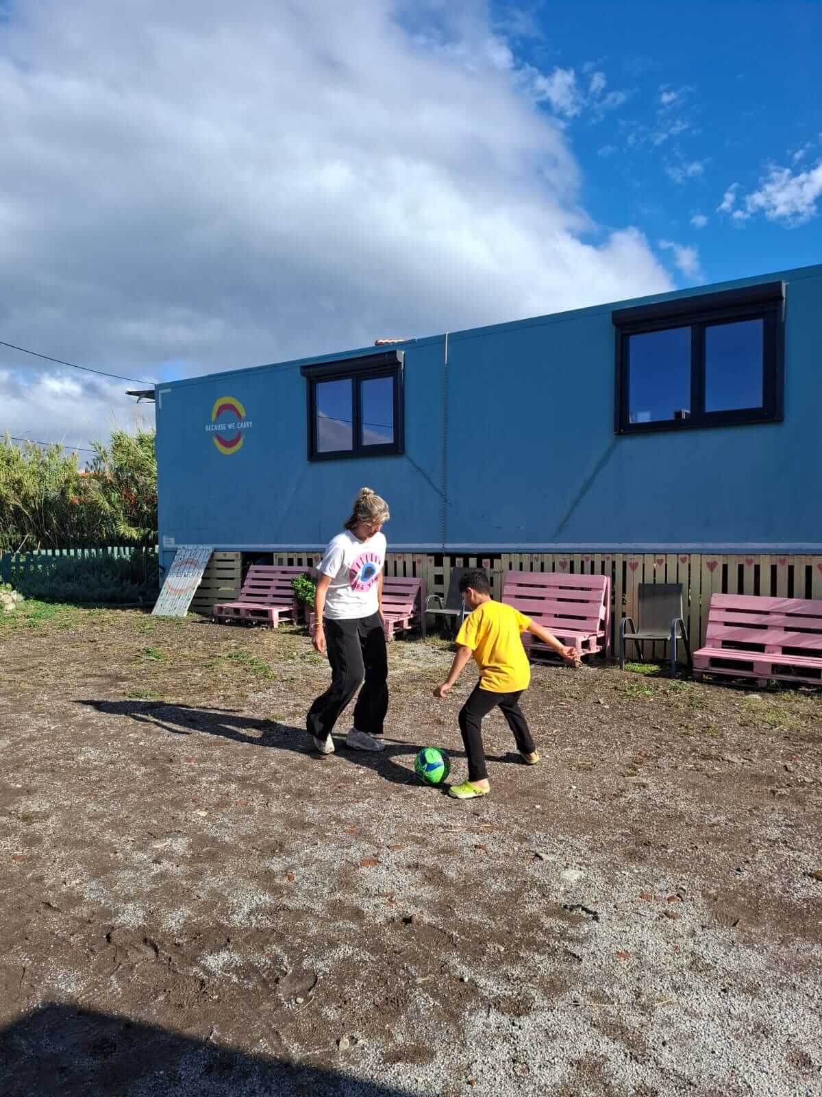 Some of us spend the day in the storage room, surrounded by boxes of donated clothes and tiny shoes. Others are immediately swept away by the children. One volunteer is adopted by a little girl who won’t let go of her hand for hours. They swing, color, and chase each other around the garden, speaking in a language made of smiles. Nearby, a few boys sit quietly with paintbrushes, lost in their own worlds.
