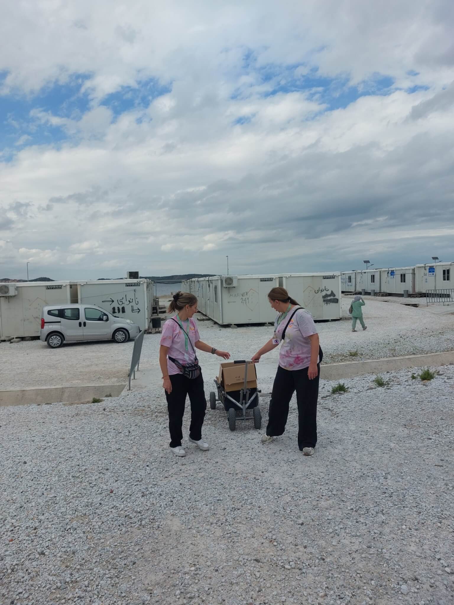 After just five minutes after departing from Mytilini, we see what from far looks seems like a huge white camping. A closer look reveals rows of white tents, so tightly packed that no one seems to move between them. From here, it almost feels uninhabited. A vast wasteland. Only police officers walk around the perimeter, enforcing the sense of a restricted, uncrossable boundary. We bypass it for now, heading to meet the team of Because We Carry.