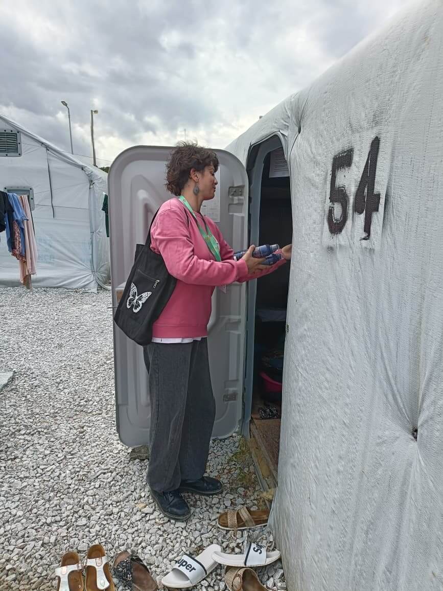 From the organization’s garden, we walk toward the camp with empty trolleys in hand, while Sanne drives ahead with the van full of supplies. At the gates, we unload boxes of hygiene kits, strollers, and essentials, then split into teams. Today we knock on the doors of new arrivals, deliver basic kits, and share information about activities: beauty mornings, creative afternoons for children, pregnancy workshops, and a small celebration planned for later in the week.