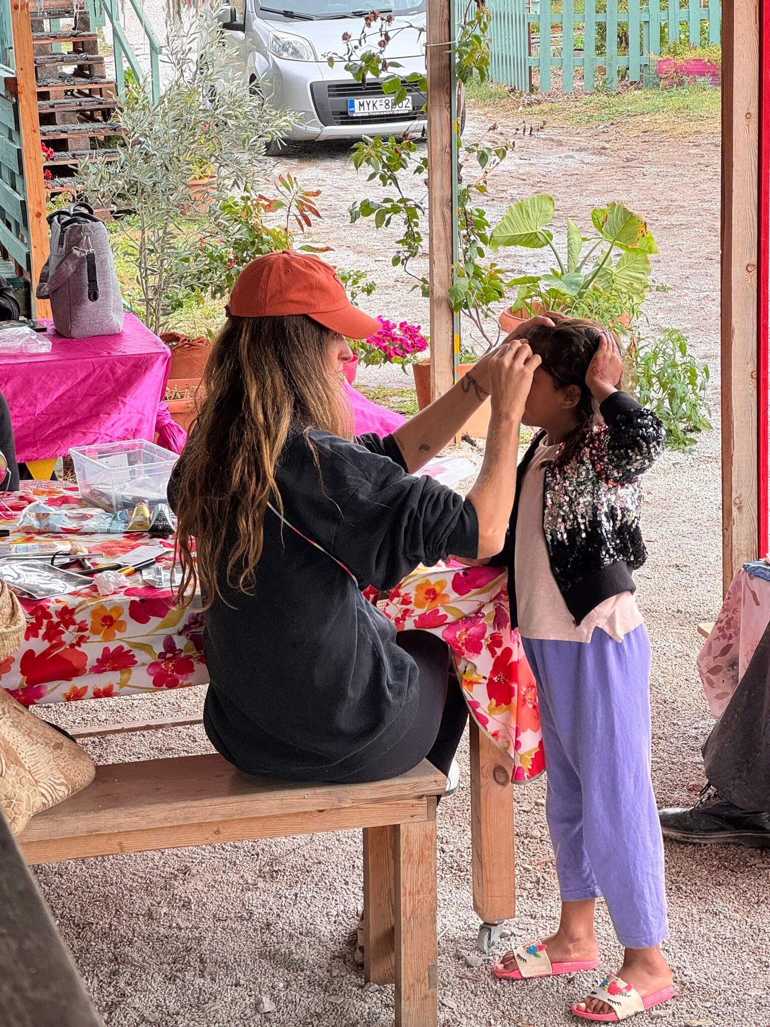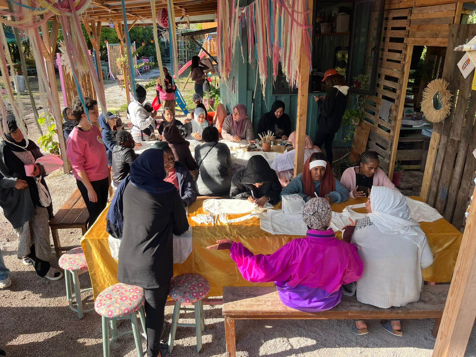 In another corner, the women’s beauty space comes alive. It’s a small garden hidden from the road, protected from curious eyes. No men enter, and no photos are taken. There are only mirrors, nail polish, face masks, and laughter. For a few hours, the outside world fades. We chat, apply masks, paint nails, paint bags. They trust. Not just us, but the space itself. Many take their veil off and many videocall their families.