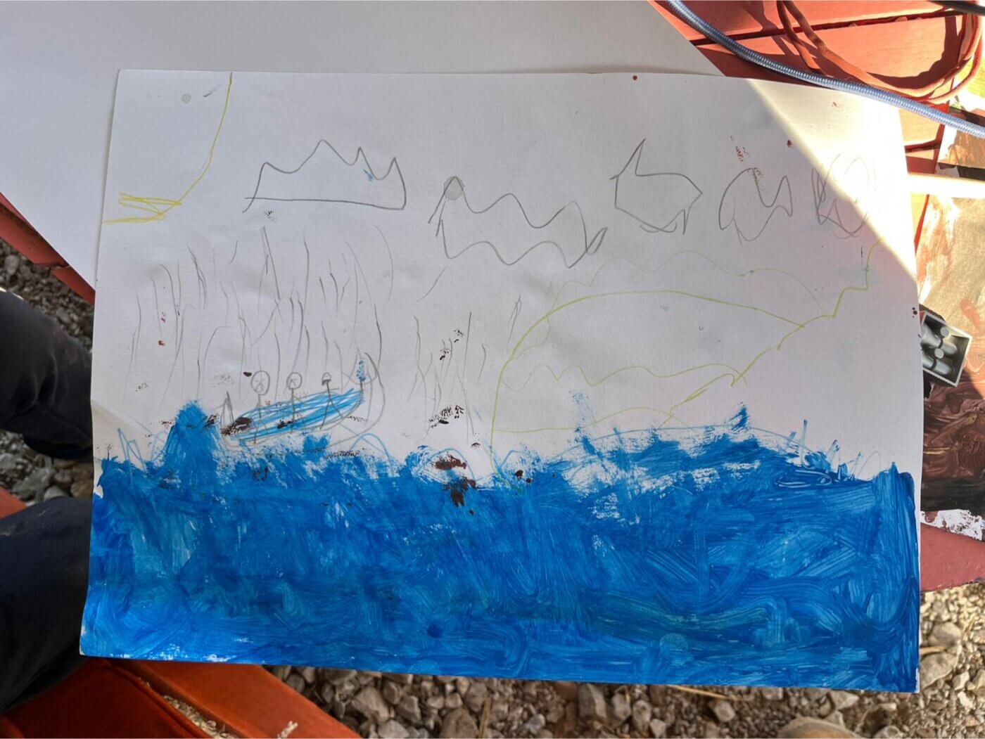 One of them paints a small boat caught in huge and scary waves. The longer you look, the heavier it feels. Details that narrates a story that no child should not be telling. Scary and sad faces on the boat, with blue paints covering its floor and angrily invading their space. All of us cannot avoid facing the harsh reality that these kids. Even if smiling and apparently happy, will always carry with them traumatic experiences. This draw us back to reality and a thought goes to the kid died drowned by the Mediterranean sea and a blind societyy few days ago. This child, we are playing and having fun with, could have been him.