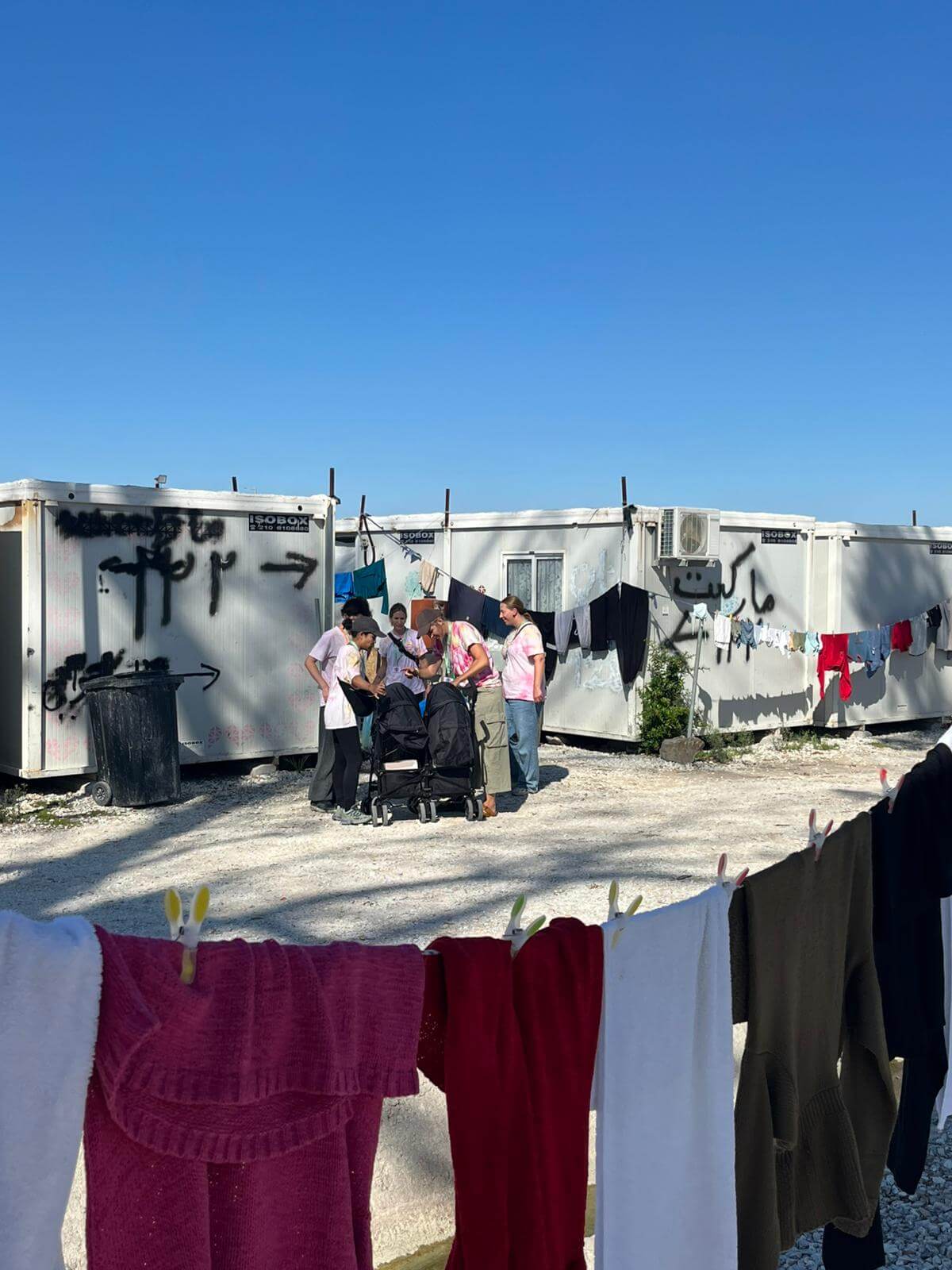 We are welcomed by Sanne, who will be responsible for our presence in the camp this week. She has been living on the island for one year and a half. She introduces us to the permanent volunteers: Shahzaib, Myrthe, and Irene. We introduce ourselves: Shishi, Nana, and Camilla from TGOB, along with Inge from Brussels and Sara from Zurich, who have joined TGOB gatherings before.